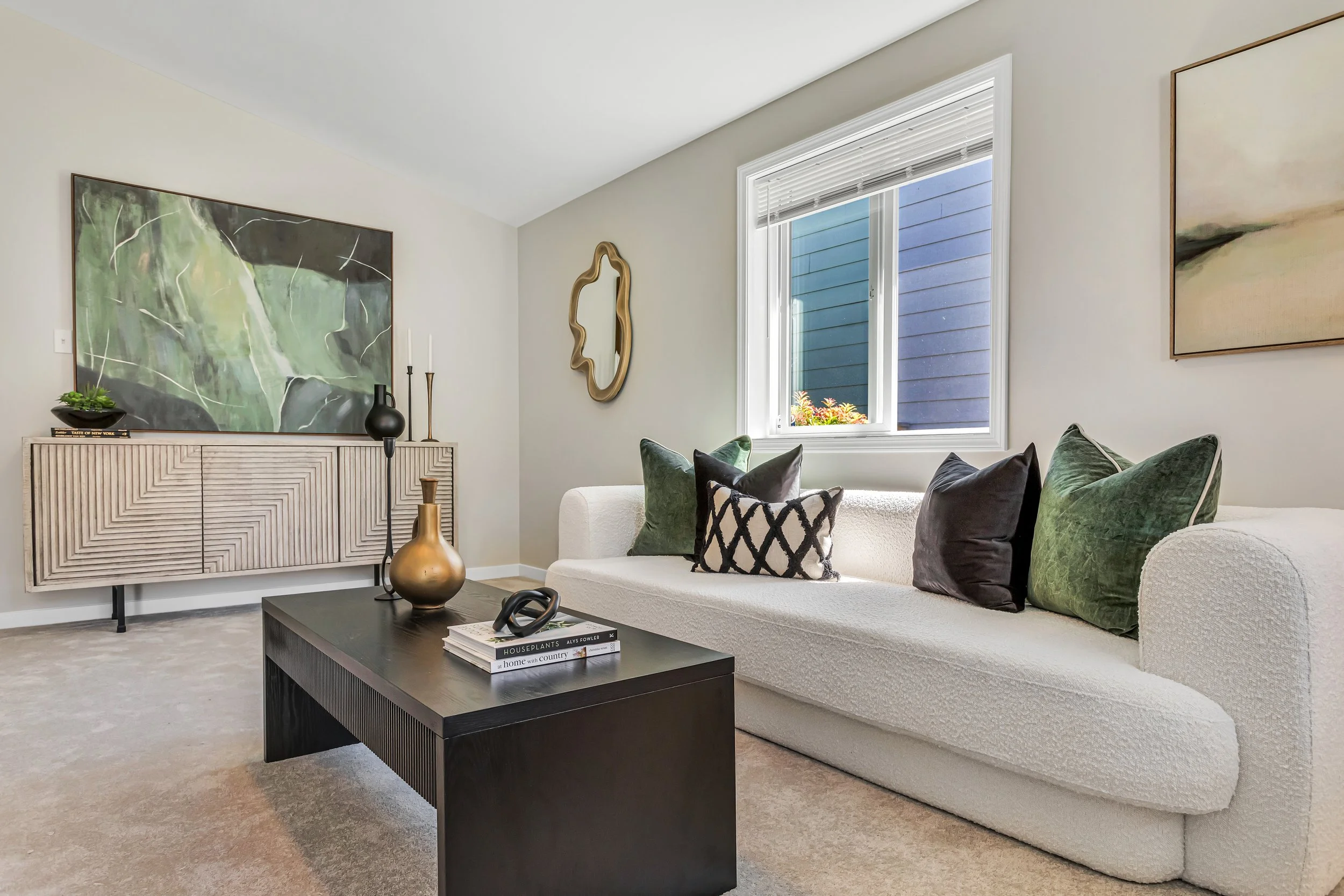 To complete the look, we incorporated sculptural décor, warm metallic accents, and simple artwork to keep the space visually interesting without overwhelming it. The result is a living room that feels approachable, polished, and easy to imagine living in — an ideal setting for buyers to instantly feel at home.